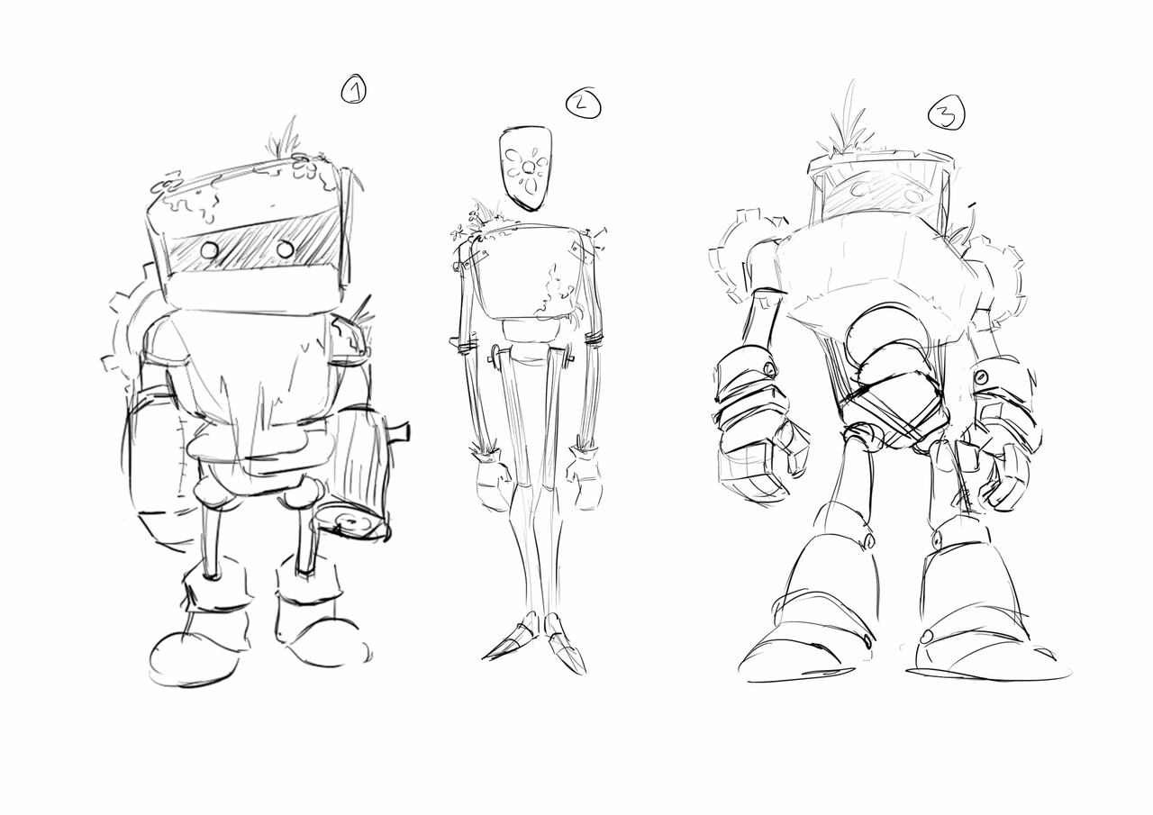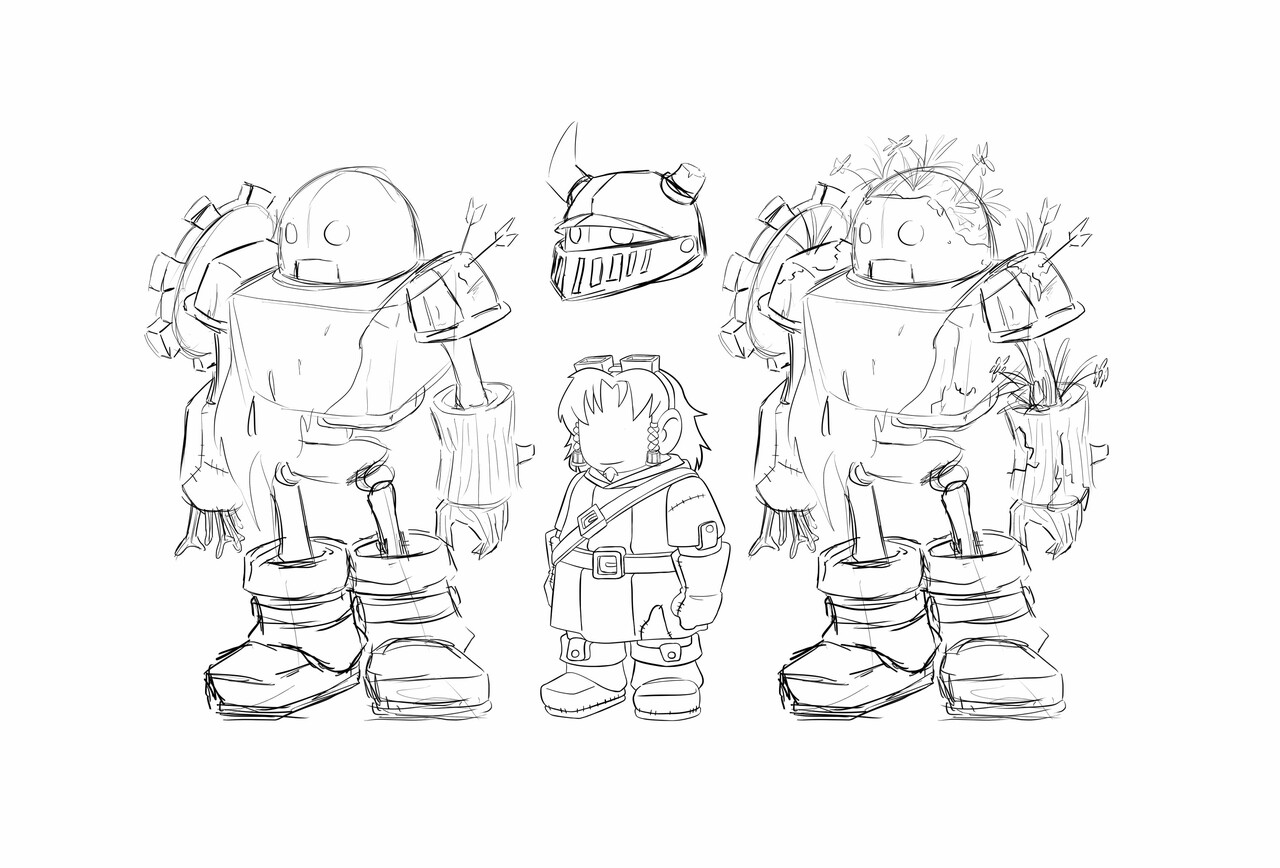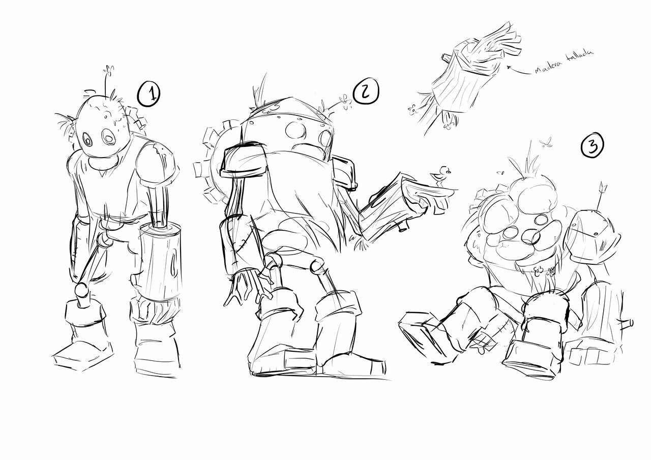 La historia solo tiene dos personajes. El protagonista se diseñó tomando como inspiración las ilustraciones del instructivo del videojuego en cuestión, añadiendo algunos detalles y haciéndolo un poco más oscuro. El golem se diseñó de manera original, con la única directriz de que se viera hecho con una mezcla de metal y madera, y que la madera se viera desnuda, con ramas y pedazos de hoja.