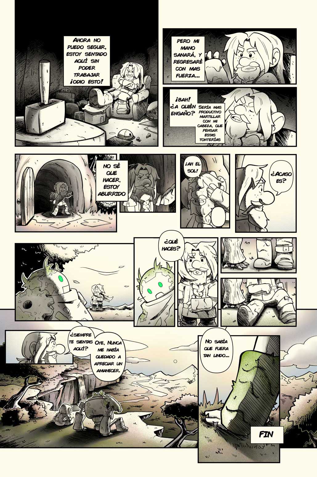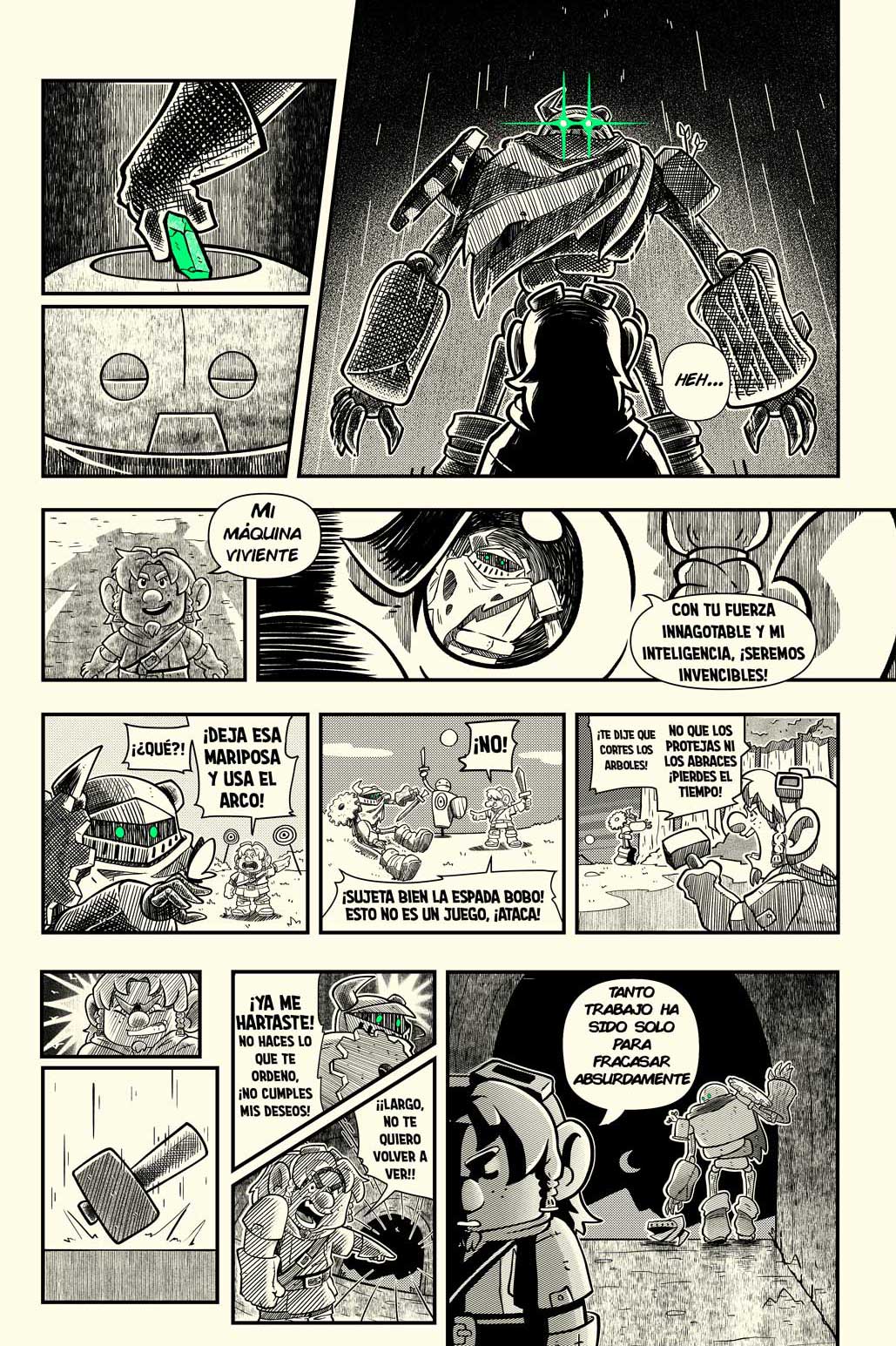 - Página 4: Fracasa con su nuevo propósito y encuentra al primer golem, lo que le hace reflexionar.