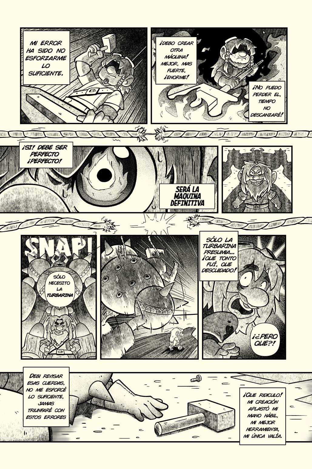 - Página 3: Su obsesión lo lleva a crear un golem más grande, más complejo.