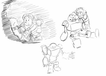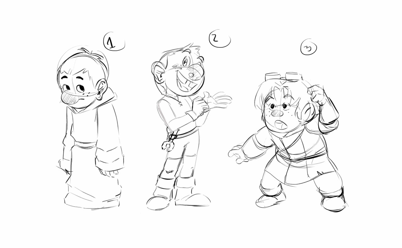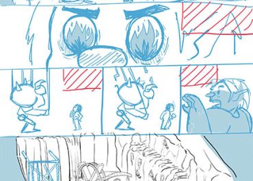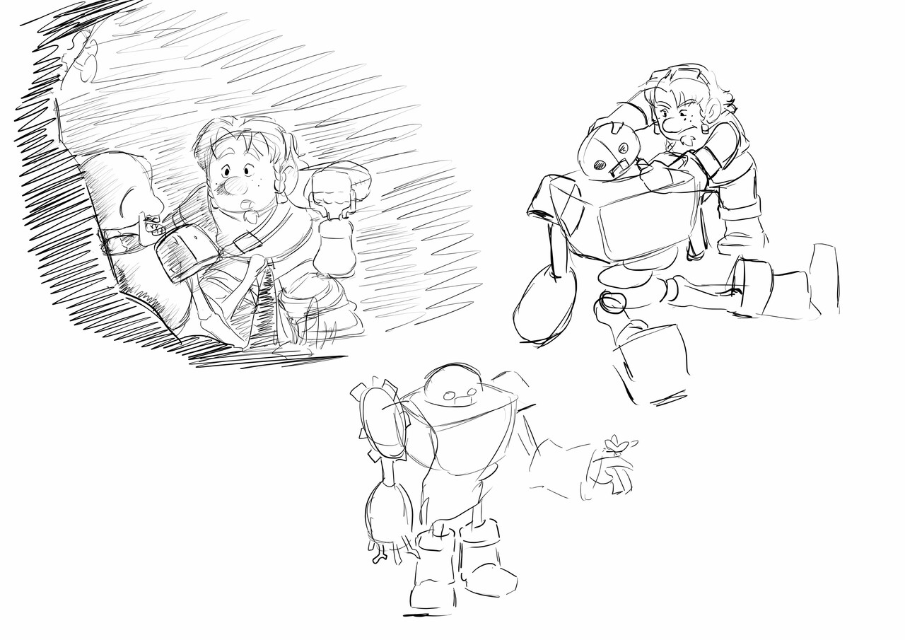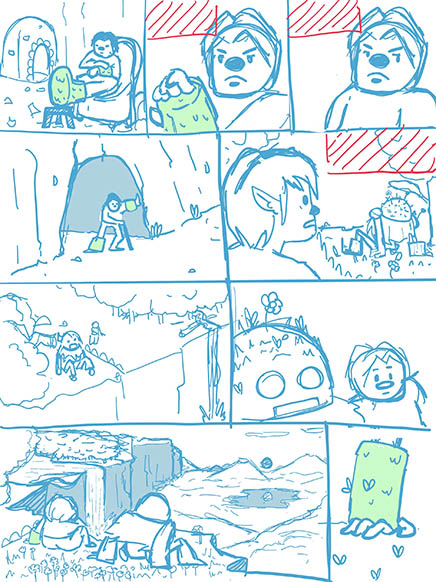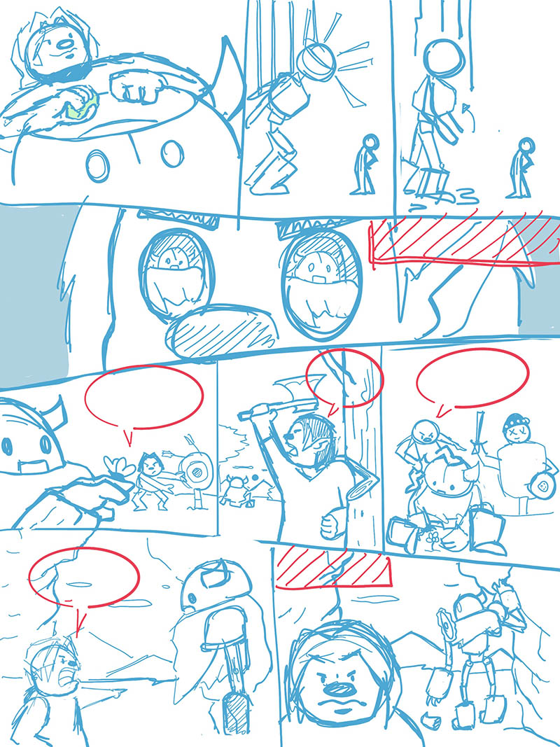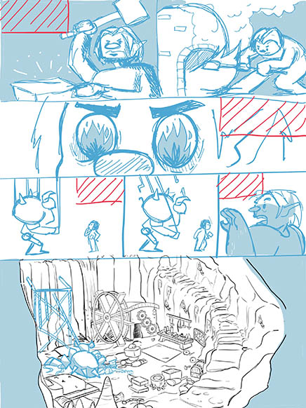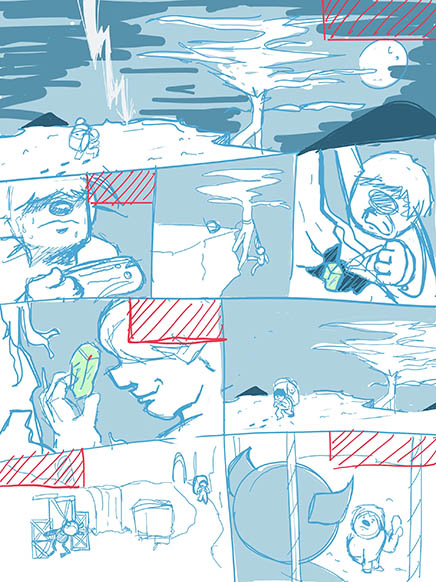 Esto nos ayudó también a comenzar a desarrollar concepts tanto de los personajes como de los lugares, mientras se terminaba de pulir la historia.Al tener la historia escrita, se hacen thumbnails para tener una mejor idea de cada viñeta e ir pensando en encuadres.