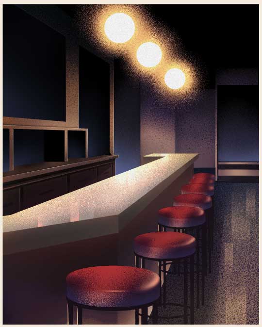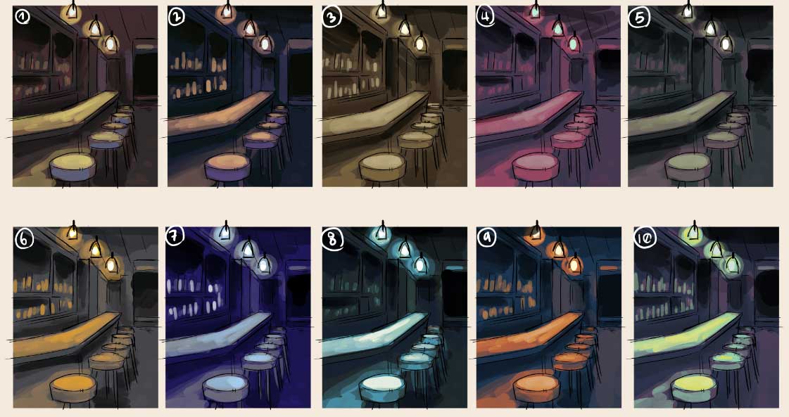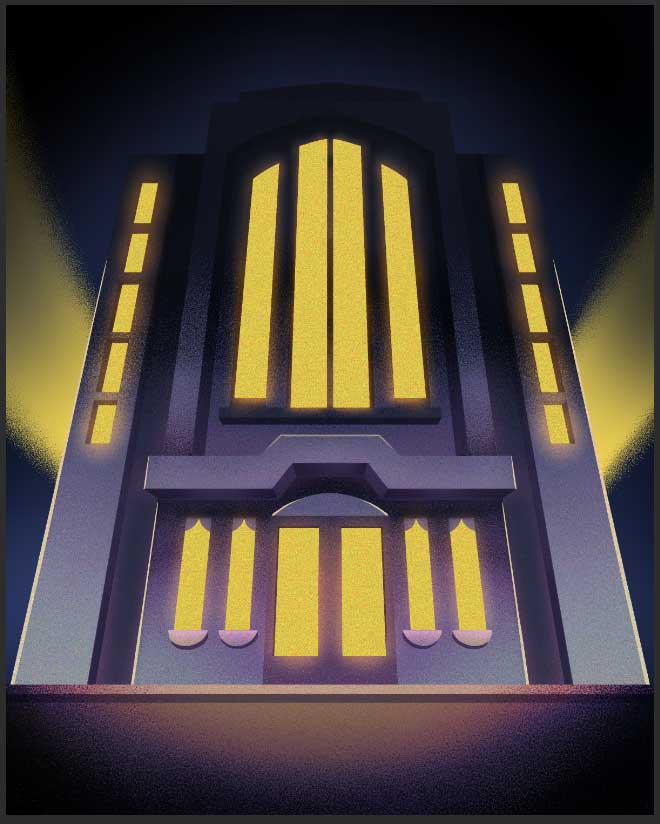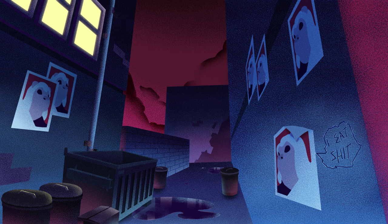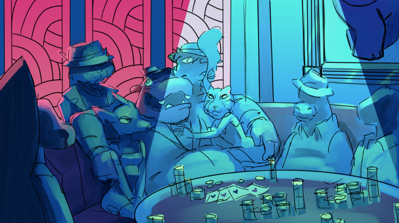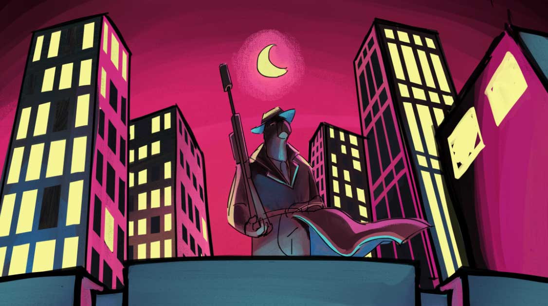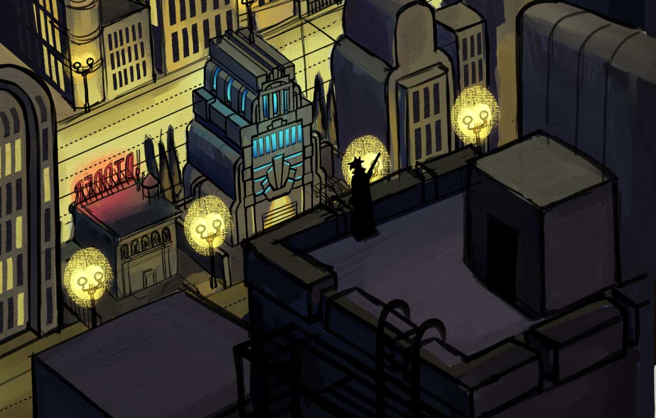 Desarrollamos una ciudad con estilo Art déco con un toque de Streamline. Las texturas de los fondos se realizaron con un grano denso y notorio, utilizando la iluminación exagerada y el color como elementos narrativos: azul y negros para los mafiosos que se ocultan de noche, y magenta para los justicieros que iluminan poco a poco los escenarios.